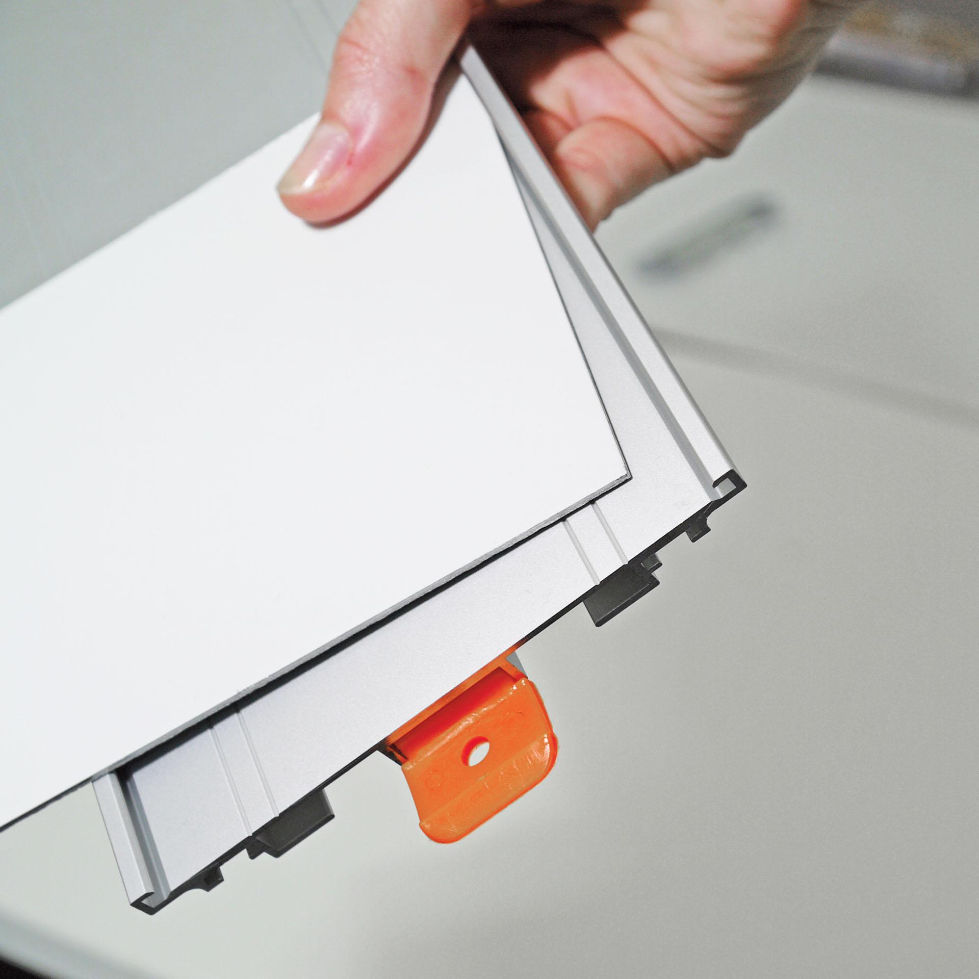 La targa a bandiera è composta da un pannello in alluminio verniciato bianco, pronto per essere personalizzato con pellicola adesiva o stampa diretta. Il design è completato da una cornice smussata e angoli in ABS verniciato argento, che conferiscono al sistema uno stile sobrio ma raffinato – perfetto per attirare l’attenzione senza essere invasivo.