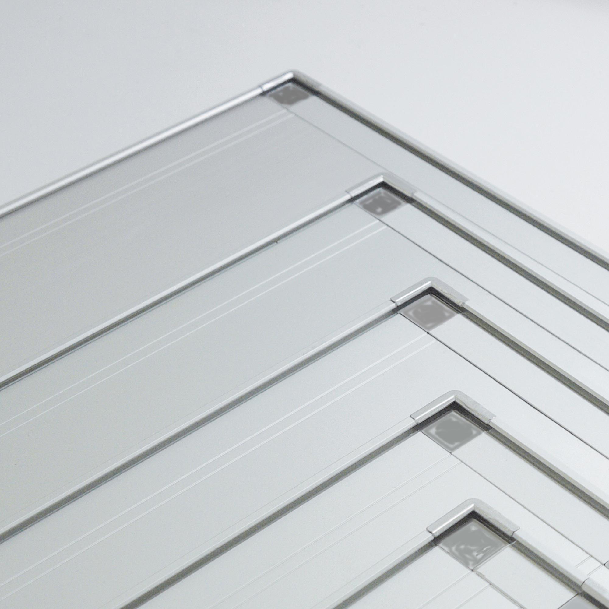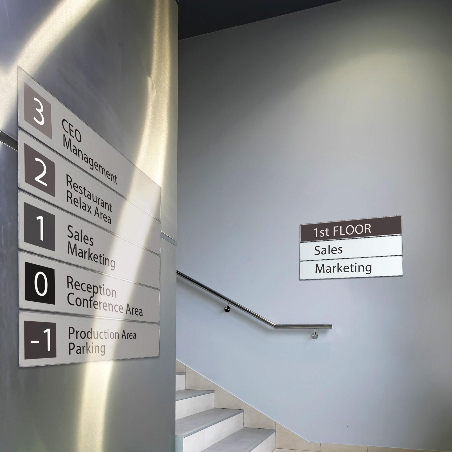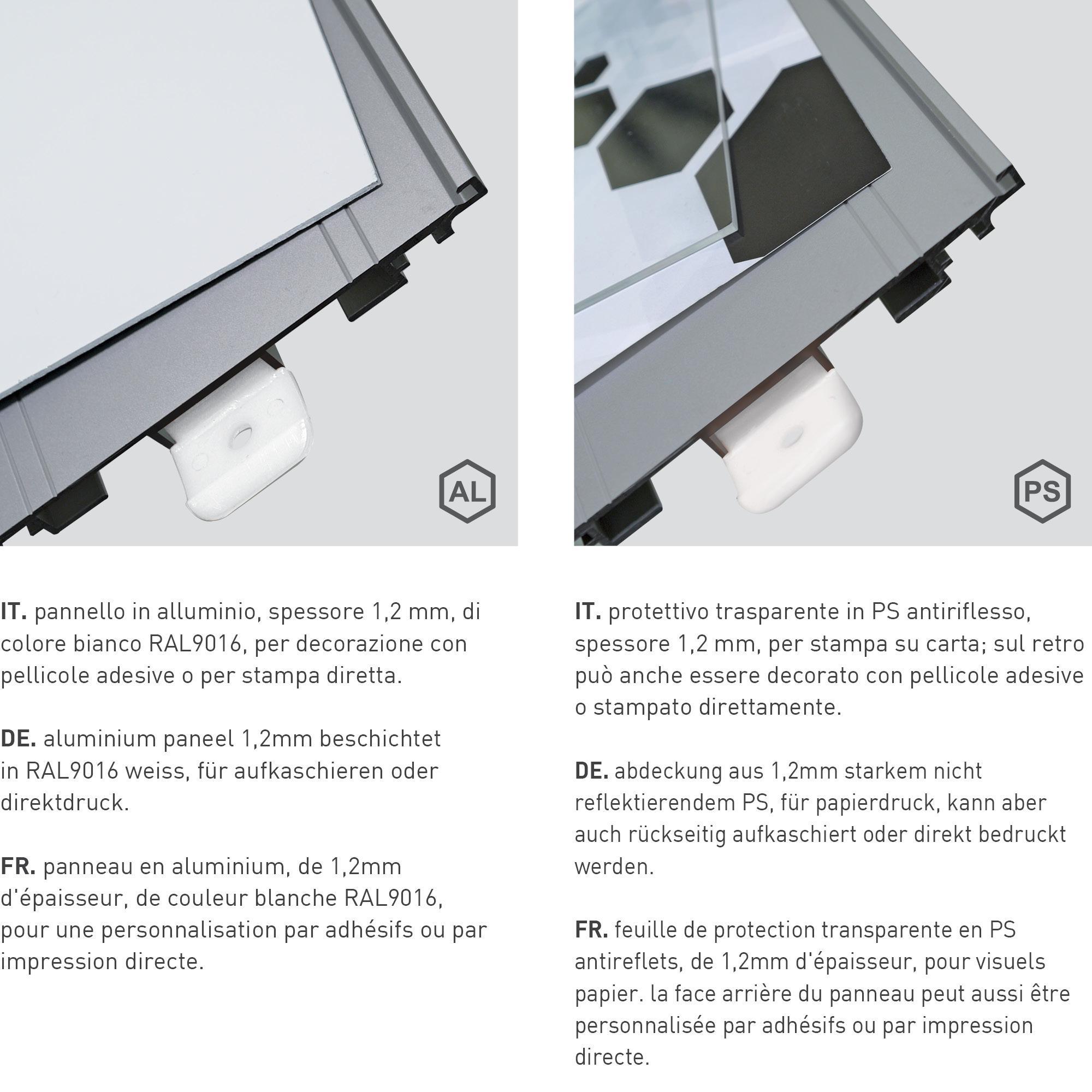 Pannello a parete della linea signcode, con profili in alluminio anodizzato color argento. Il cartello modulare a parete è dotato di un pannello di alluminio verniciato che può essere decorato con pellicola adesiva o stampato direttamente. I cartelli modulari intercambiabili e i pannelli riepilogativi della linea signcode sono disponibili in molti formati.