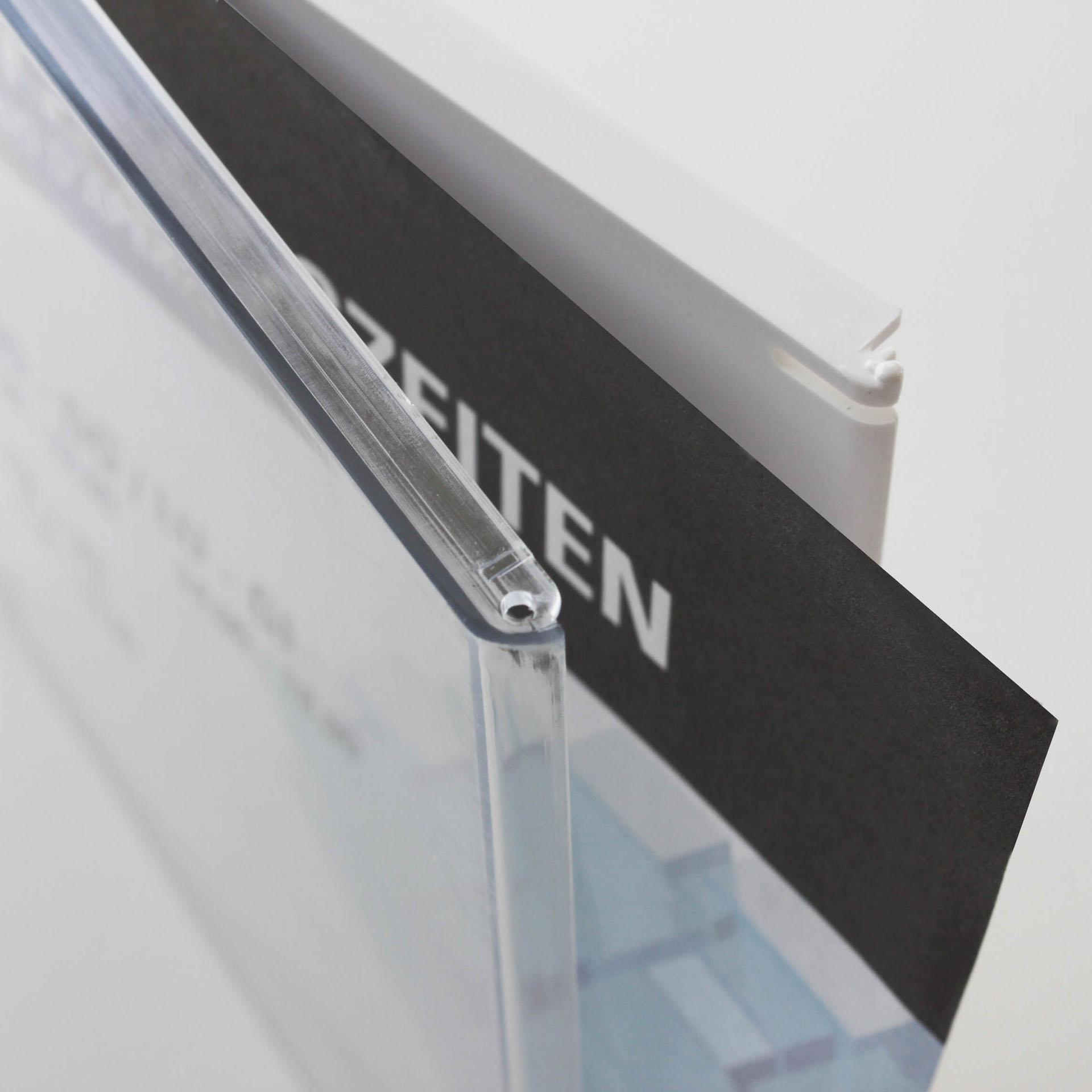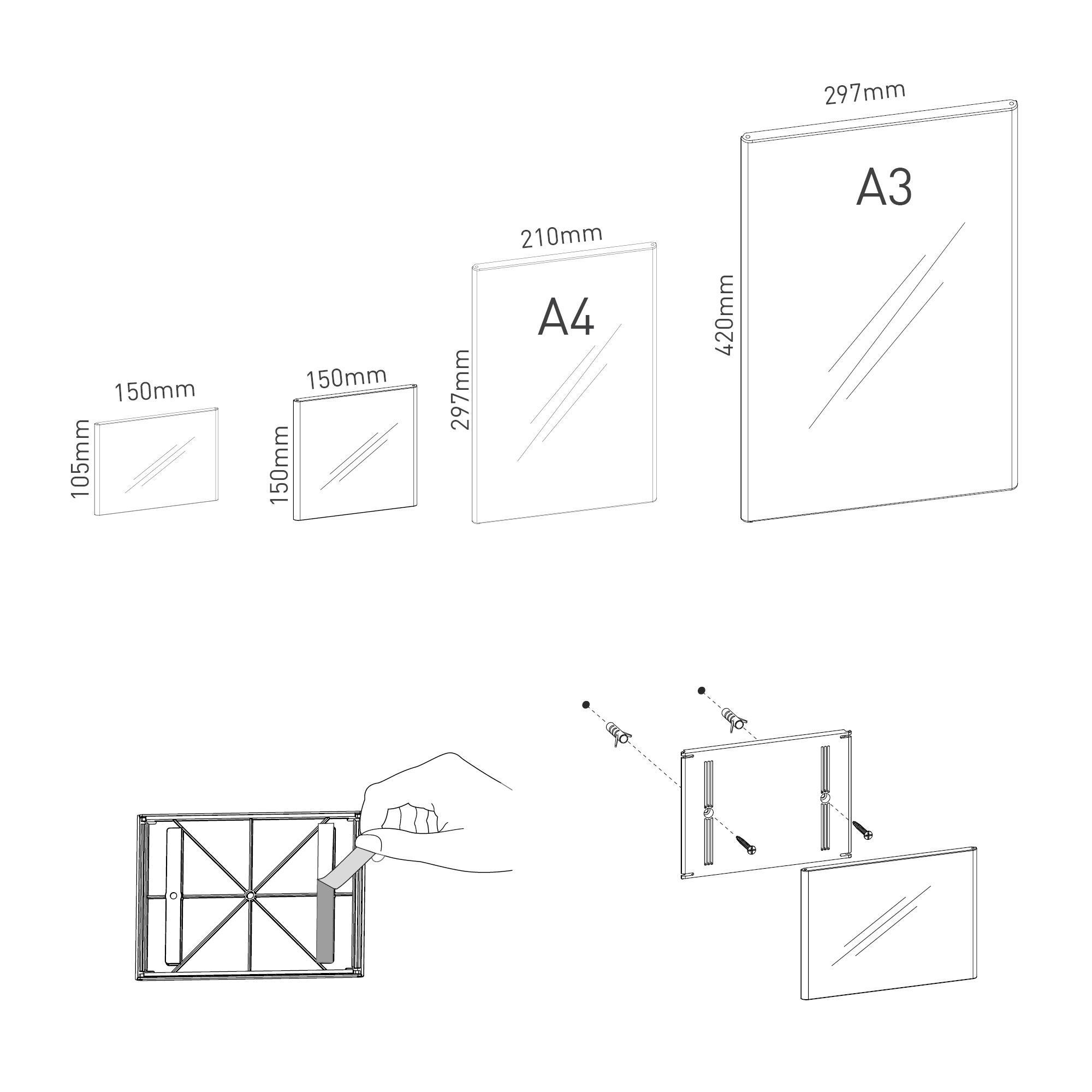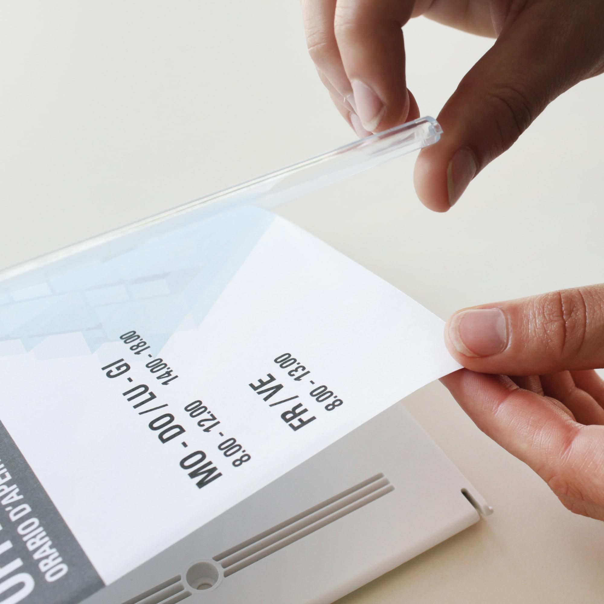 Sottile, utile e facile da montare! Il nostro Smartquick in policarbonato stampato in pressofusione si monta molto facilmente fissandolo con viti o tramite biadesivo che troverete all'interno della confezione (in caso per esempio di applicazione su superfici lisce come il vetro). Ideale per quando avete bisogno di esporre informazioni in supporti senza cornice proteggendole dalla polvere. Per cambiare l'informazione basta semplicemente fare pressione sul lato destro o sinistro della copertura trasparente. Il retro è di color bianco, perfetto come sfondo.