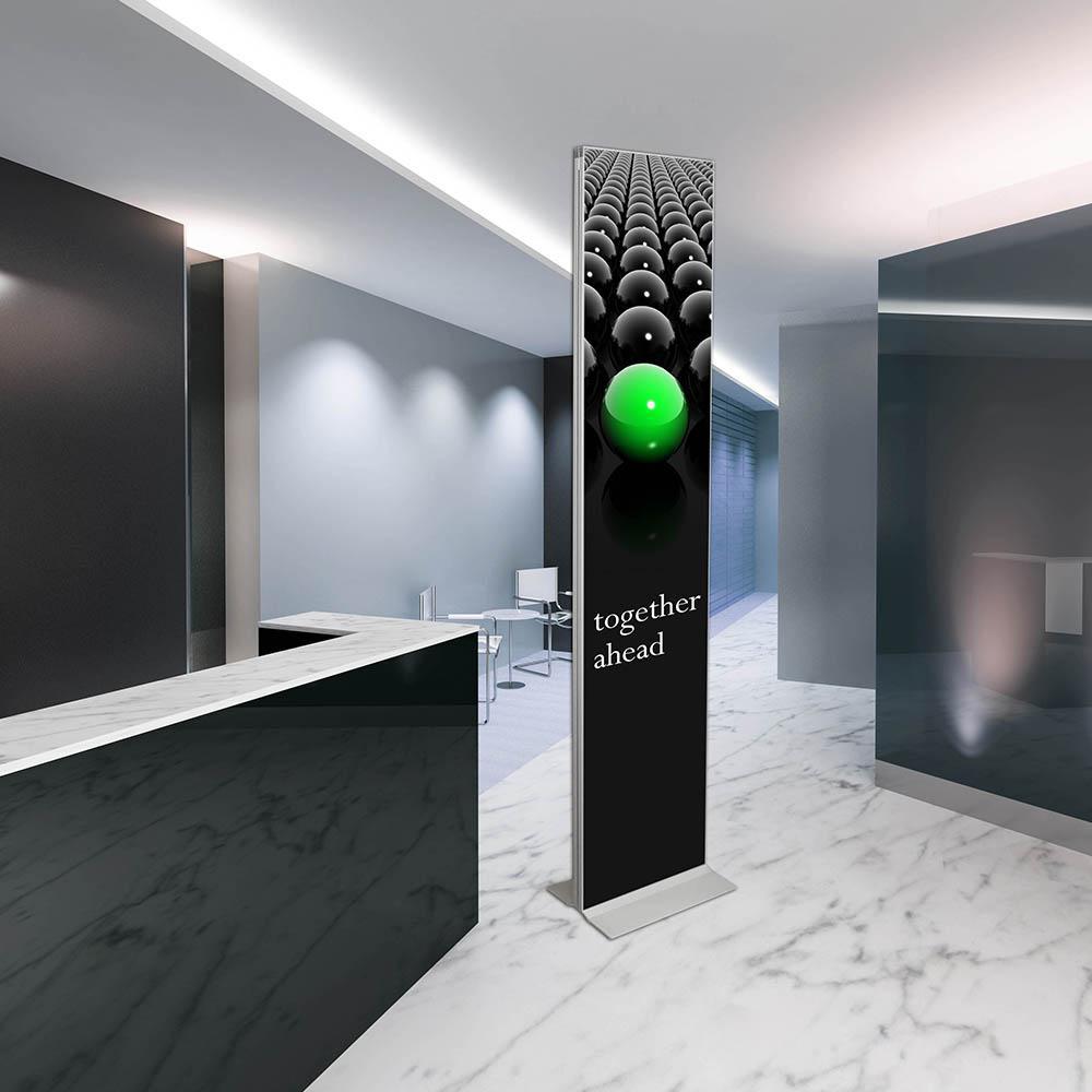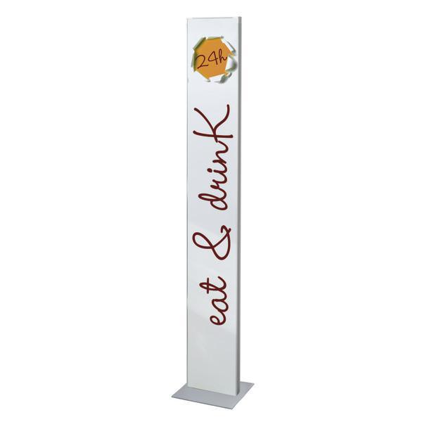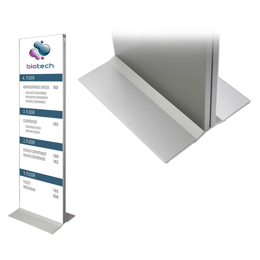 Ipoint è un totem fornito completo di due pannelli in alu bond color argento e bianco opaco per la stampa digitale. Soluzione bifacciale personalizzabile, sia sul lato frontale che sul retro. Una volta effettuata la personalizzazione, basterà incollare i pannelli direttamente ai profili. La base ha una larghezza di 320mm ed è realizzata in alluminio anodizzato.