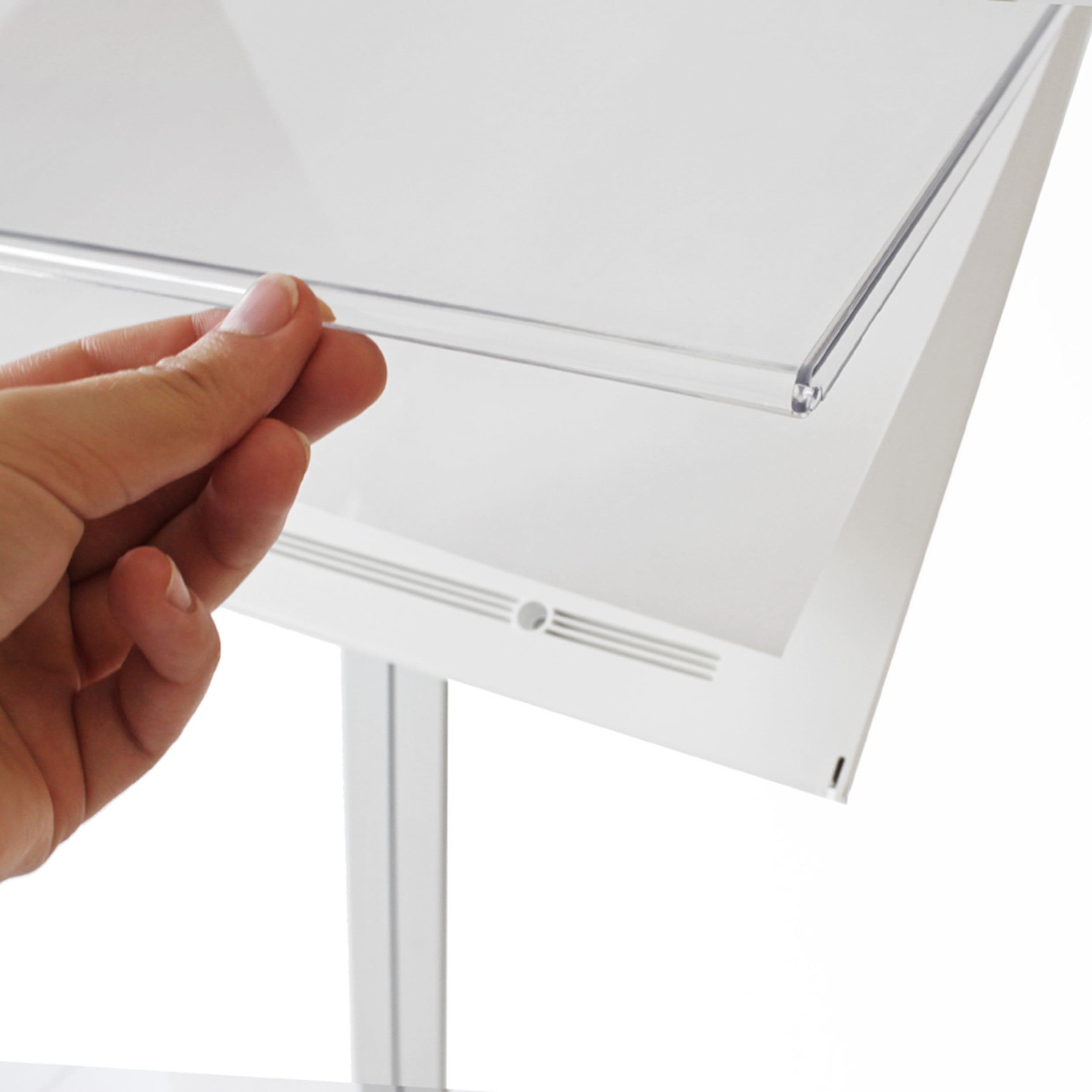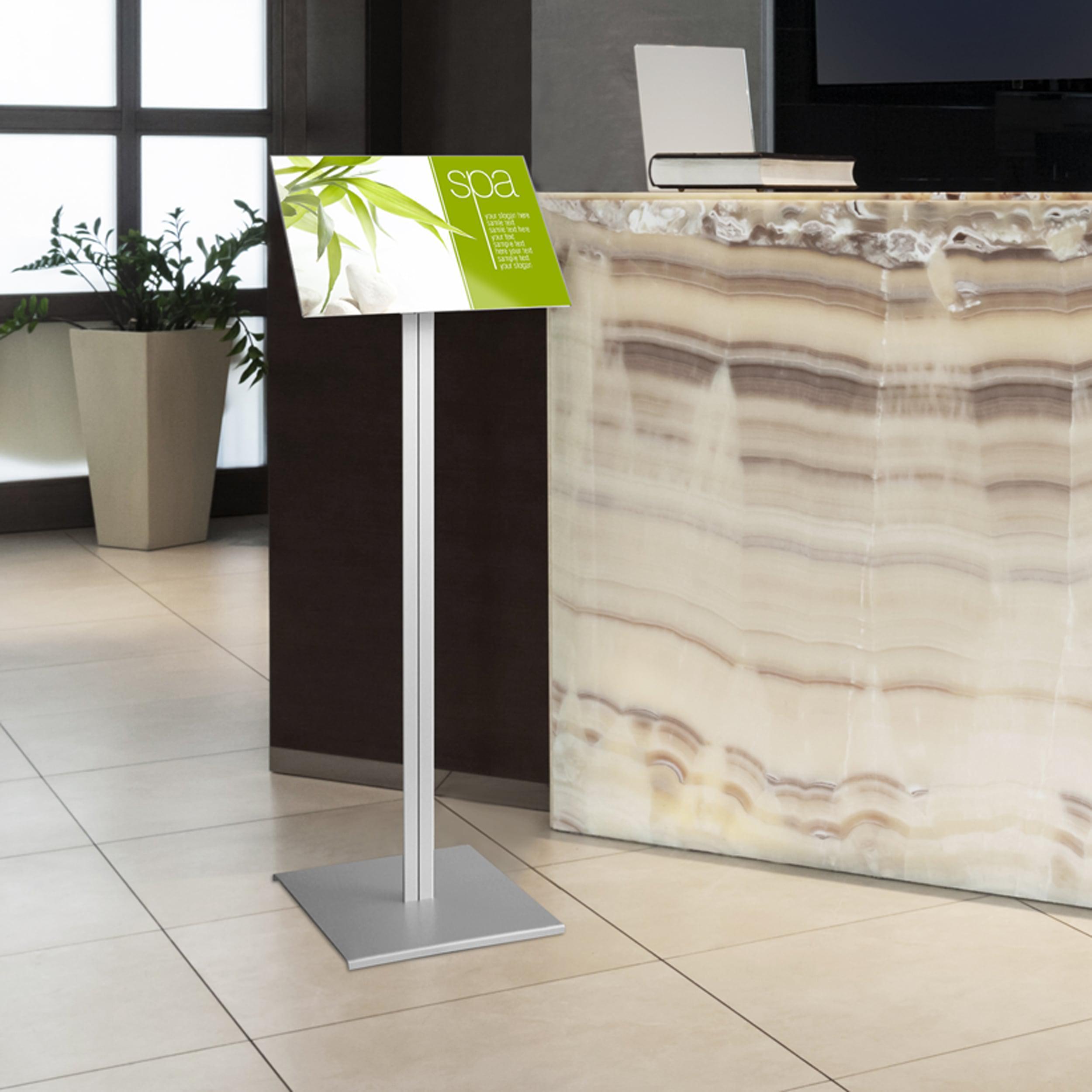 Smart Menù è l’espositore da terra ideale per menù, segnaletica o messaggi informativi. Dotato di tasca trasparente e priva di cornici, consente una facile lettura grazie all'inclinazione a 45° e alla possibilità di orientamento orizzontale o verticale. La struttura in alluminio anodizzato e policarbonato di alta qualità assicura resistenza e stile in ogni ambiente.