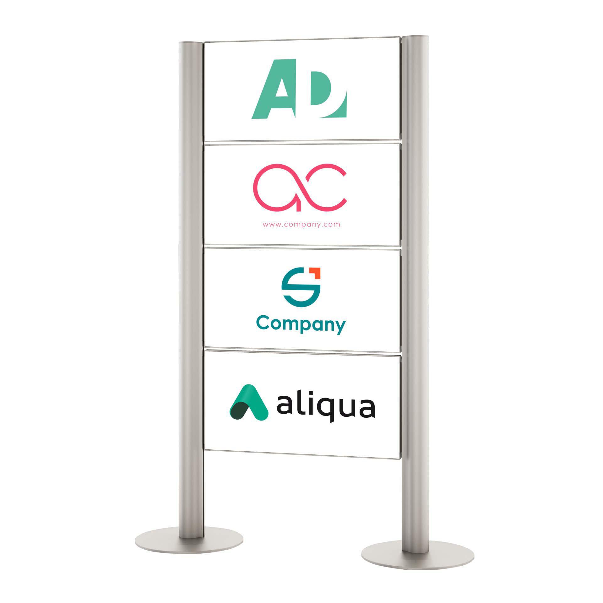 Signcode Extern è una soluzione bifacciale e flessibile, offre la possibilità di combinare formati diversi in modo modulare. le indicazioni bifacciali possono essere personalizzate tramite stampa diretta o plastificazione. Le indicazioni vengono inserite a scorrimento nella struttura e possono essere sostituite in qualsiasi momento.
